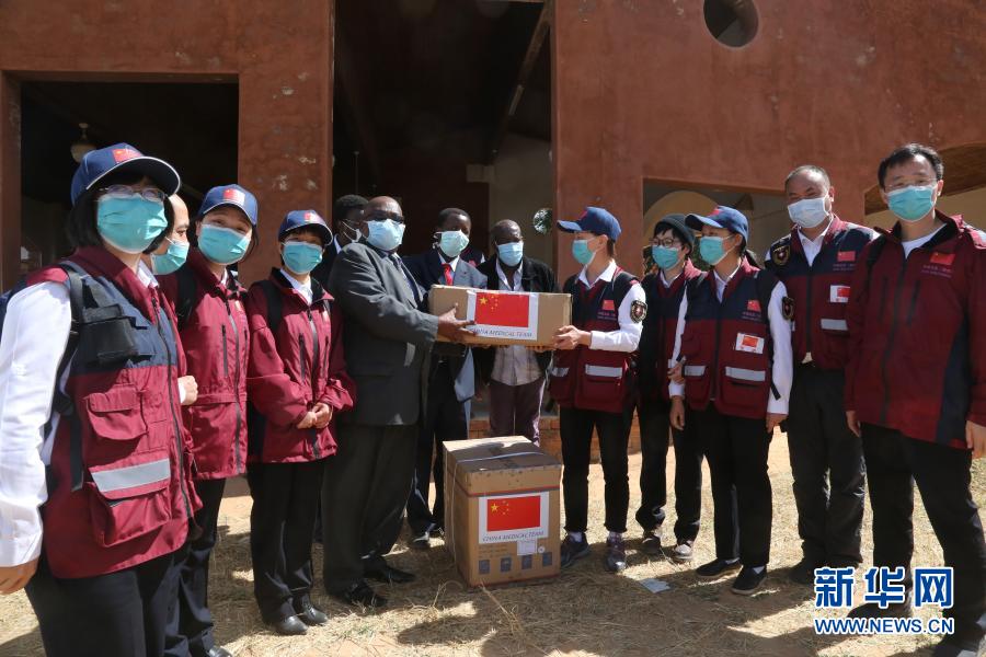 5 月 19 日,在津巴布韋中馬紹納蘭省的姆武爾維醫院,中國抗疫醫療專家組為當地醫療機構捐贈醫療物資。新華社記者 張玉亮 攝