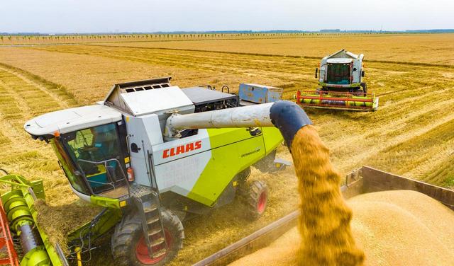 6月7日,在河南駐馬店西平縣老王坡高標準農田,收割機將剛收獲的小麥裝車。全國人吃的每27個便頭中,就有一個來自駐馬店。新華社發(趙永濤攝)