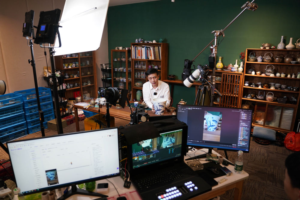 在江西景德鎮陶溪川文創街區的直播基地里,工作人員通過網絡直播推介陶瓷產品(2023年2月22日攝)。新華社記者 周密 攝