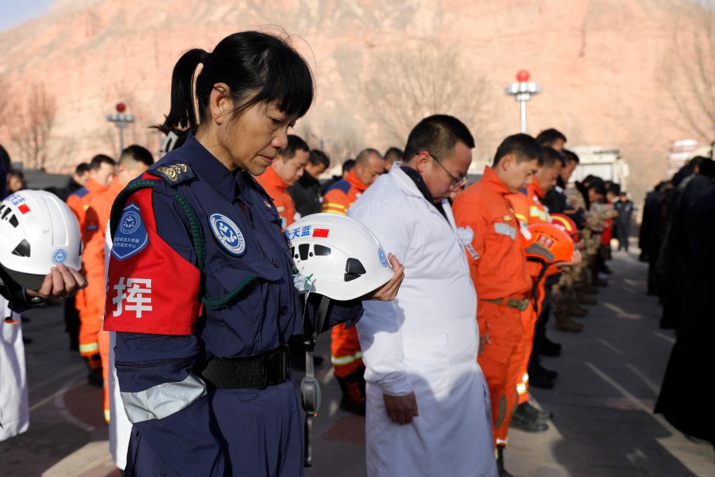 ??25日上午,甘肅省積石山縣大河家鎮(zhèn)舉行深切悼念積石山6.2級(jí)地震遇難同胞默哀儀式。救援隊(duì)伍、醫(yī)護(hù)人員、群眾代表等各界代表默然肅立,為地震遇難同胞默哀。