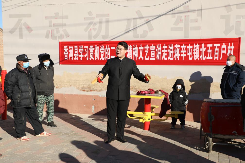 ??河北省香河縣文化館的文藝工作者張鑫銘在香河縣蔣辛屯鎮北五百戶村進行黨的二十大精神“快板宣講”(2022年12月13日攝)。新華社發