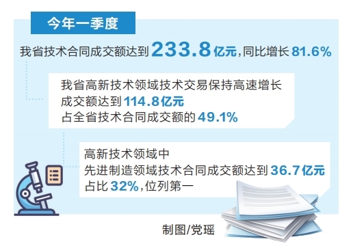 ??4月7日,記者從省科技廳獲悉,今年一季度,我省技術合同成交額達到233.8億元,同比增長81.6%。