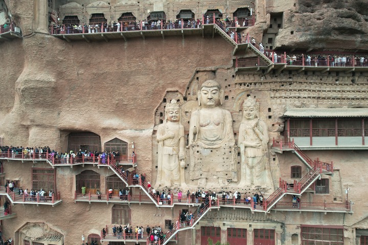 ??4月5日,游客在位于天水市麥積區(qū)的麥積山石窟游覽(無(wú)人機(jī)照片)。 新華社記者 張智敏 攝