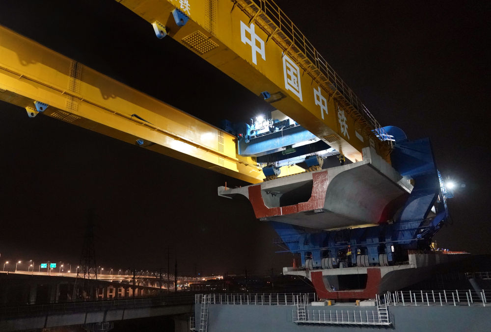 ??這是2024年3月4日凌晨拍攝的滬蘇湖鐵路全線最后一榀箱梁架設施工現場。當日,滬蘇湖鐵路全線箱梁架設完成。