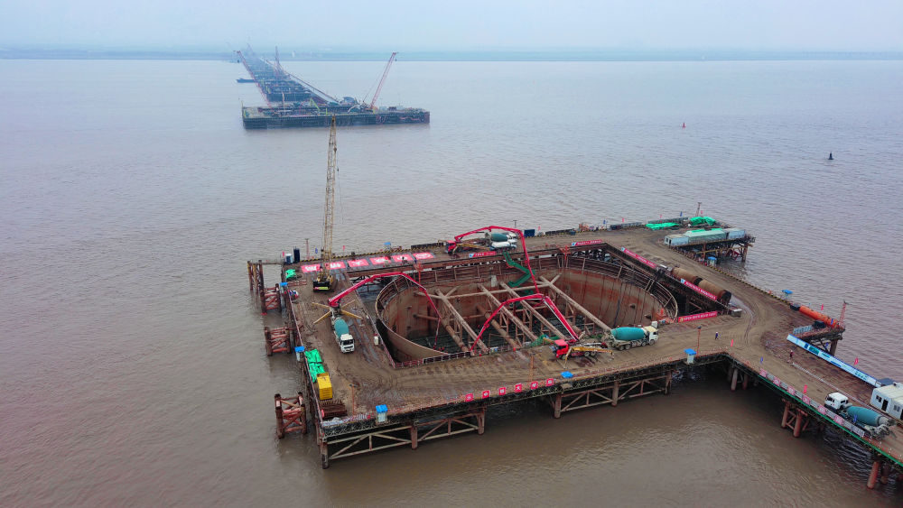 ??2024年3月27日,在江蘇啟東長江入海口北支航道江面施工現場,上海至南京至合肥高鐵控制性節點工程——崇啟公鐵長江大橋3、4號主墩承臺首次澆筑完成。