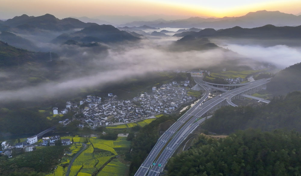 ??這是2024年3月20日拍攝的位于安徽省黃山市歙縣的黃千高速公路。黃千高速公路依山傍水,是連接安徽黃山和浙江千島湖兩大景區的旅游快速干線(無人機照片)。