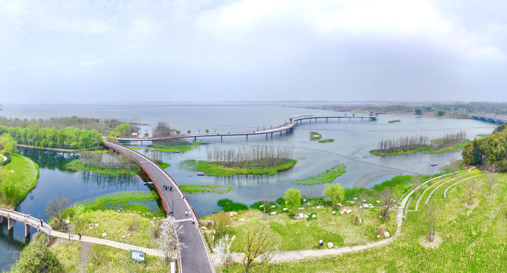 ??這是連接上海青浦和江蘇吳江兩地的元蕩慢行橋(2024年3月31日攝,無人機照片)。漫步橋上,大好風光盡收眼底。同心結形狀的元蕩慢行橋,是長三角一體化發展的生動注腳之一。