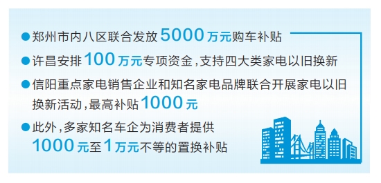 據了解,鄭州、開封等地及不少企業均開展了以舊換新促銷補貼活動。其中,鄭州市內八區聯合發放5000萬元購車補貼;許昌安排100萬元專項資金,支持四大類家電以舊換新;信陽重點家電銷售企業和知名家電品牌聯合開展家電以舊換新活動,最高補貼1000元。此外,多家知名車企為消費者提供1000元至1萬元不等的置換補貼。值得關注的是,此次以舊換新“綠意”十足。各大家電家居企業聚焦智能智聯產品推出優惠活動;開封開展家電專項節能補貼活動,單件商品可補貼5%至20%。