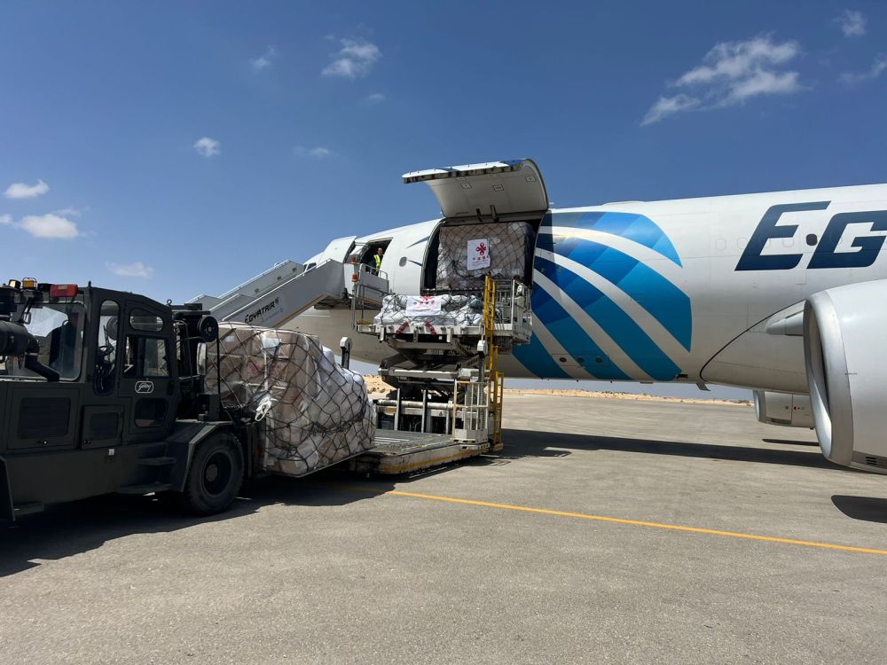2024年4月19日,工作人員在埃及阿里什機場卸載中國援助巴勒斯坦的物資。新華社發