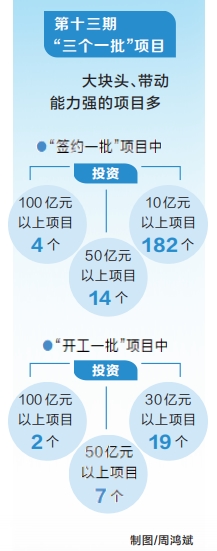 分析第十三期“三個一批”項目,從投資額度看,大塊頭、帶動能力強的項目多。本期活動“簽約一批”項目中投資100億元以上項目4個、50億元以上項目14個、10億元以上項目182個;“開工一批”項目中投資100億元以上項目2個、50億元以上項目7個、30億元以上項目19個。