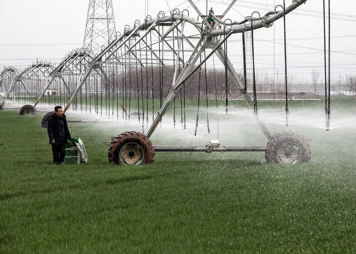 ??2024年3月18日,在河南省焦作市博愛縣孝敬鎮東原莊村瑞輝家庭農場,村民使用全自動指針式噴灌機進行澆灌作業。新華社發(程全攝)