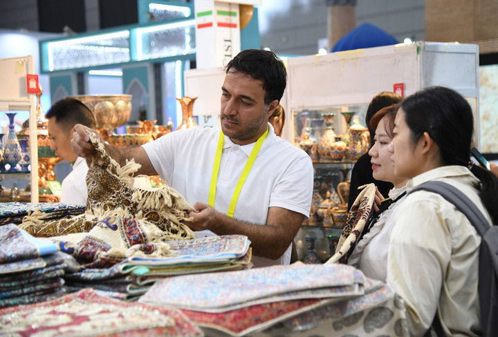 ??2024年9月20日,在陜西省西安市舉行的第八屆絲綢之路國際博覽會上,來自伊朗的參展商(前左一)向觀眾介紹產品。 新華社記者 張博文 攝